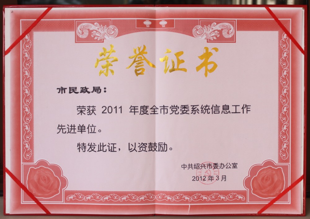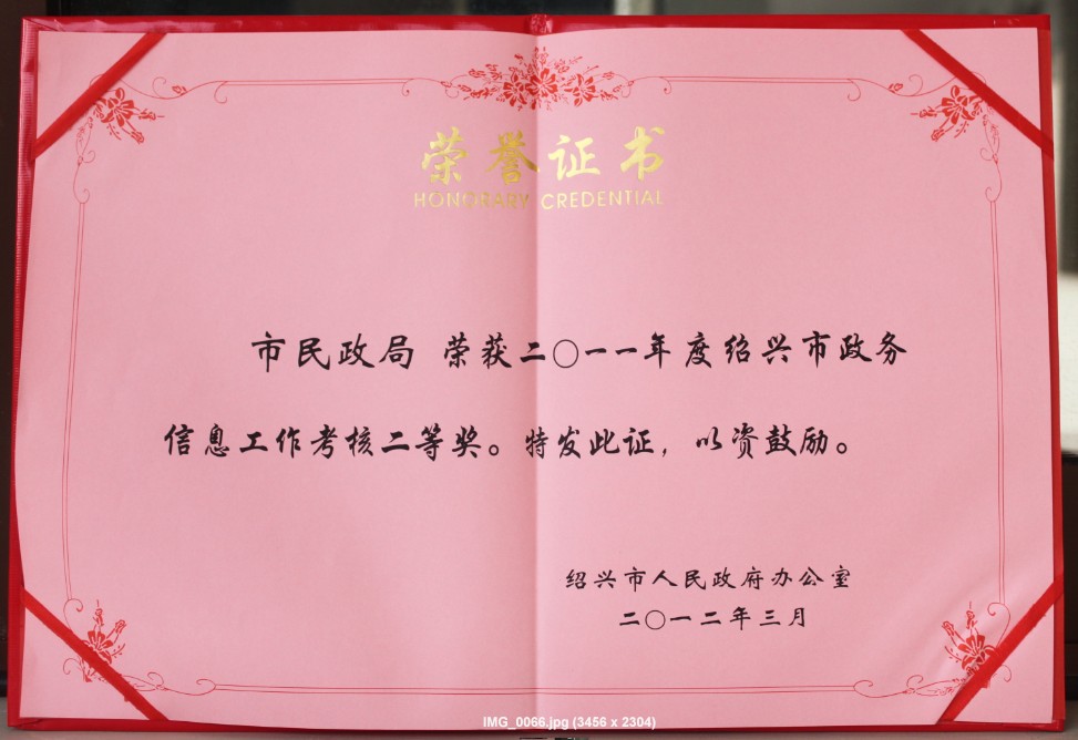 市民政局荣获2011年度绍兴市政务信息工作考核二等奖